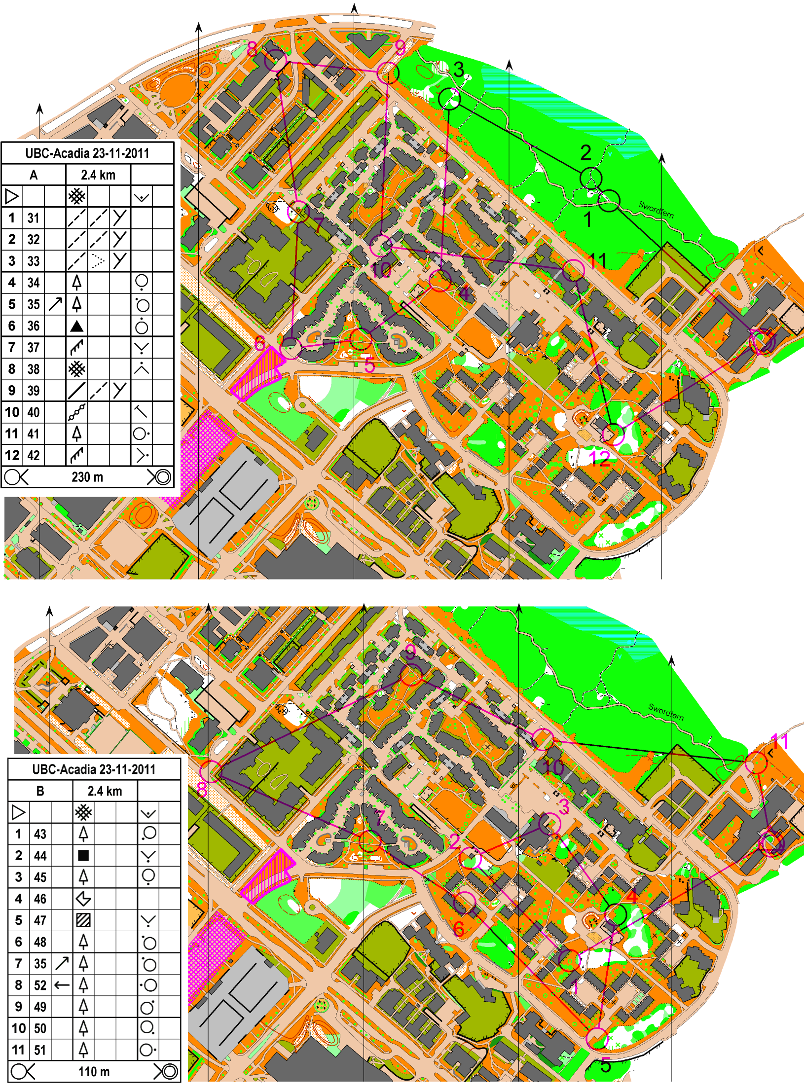 Course weaves around the buildings and mini-parks of Acadia Village, UBC, plus a very short stretch of forest park (that might be muddy).
