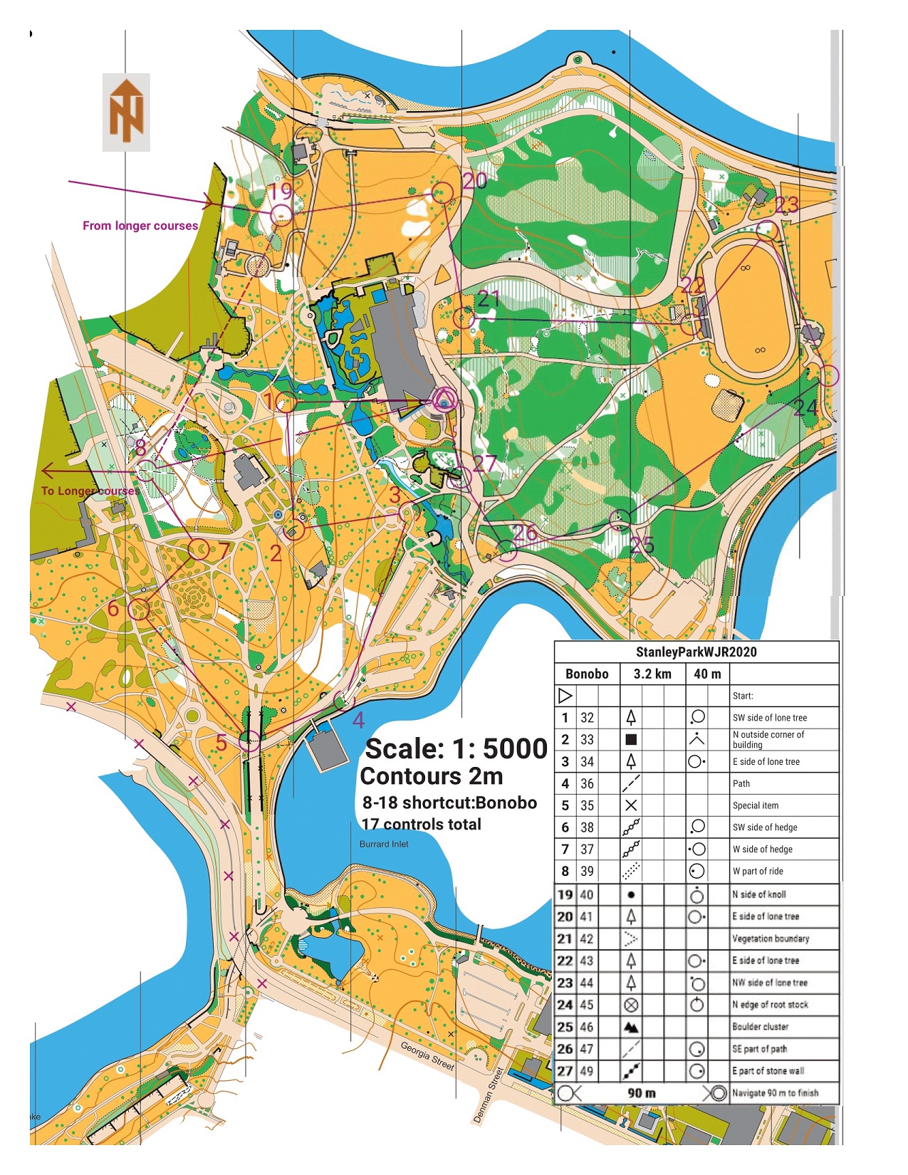 - Bonobo : 3.2km, 40m climb, focus is on route choices with few short sections through easy open forest. This course is a subset of the Gorilla and King Kong courses hence the dash line from control 8 to 19. Map is 1: 5000 scale. Intermediate level course mostly in open parks.