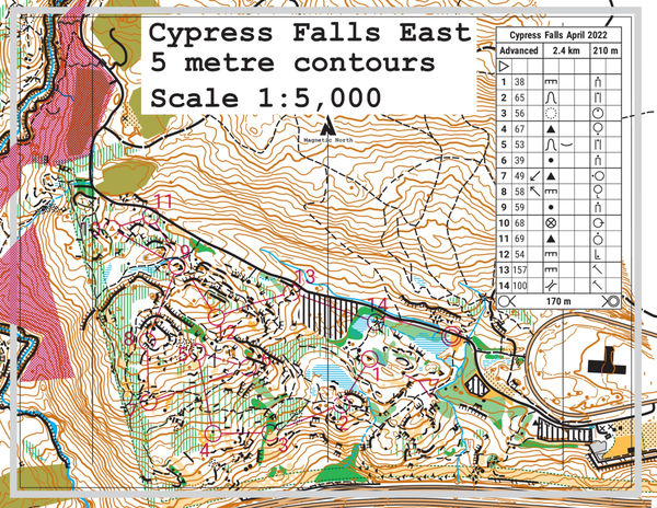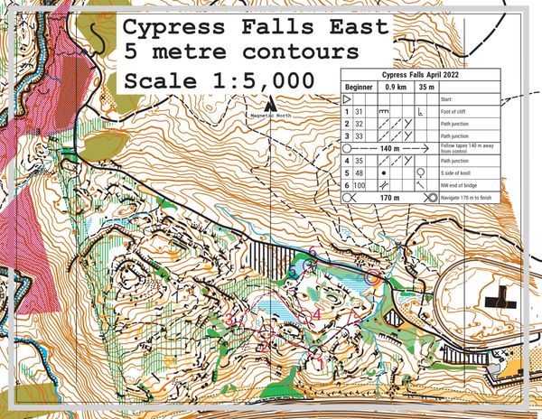 Map: is mostly new, joined to the north end of the existing Cypress Falls map. Much of it is steep coastal terrain with many small and large cliffs, rocky sections and some delightful moss areas. The map scale is 1:5,000 with 5 m contours.