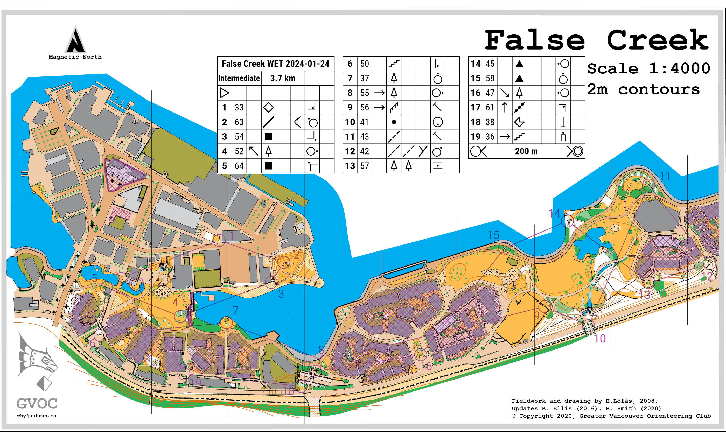 The map has been updated (thanks, Alton!) to reflect recent construction on Granville Island. There are several areas with canopies (light grey colour), and some areas passable at two levels which make for more complex navigation. Please ask one of the event organizers to give you a quick lesson if this is new to you.