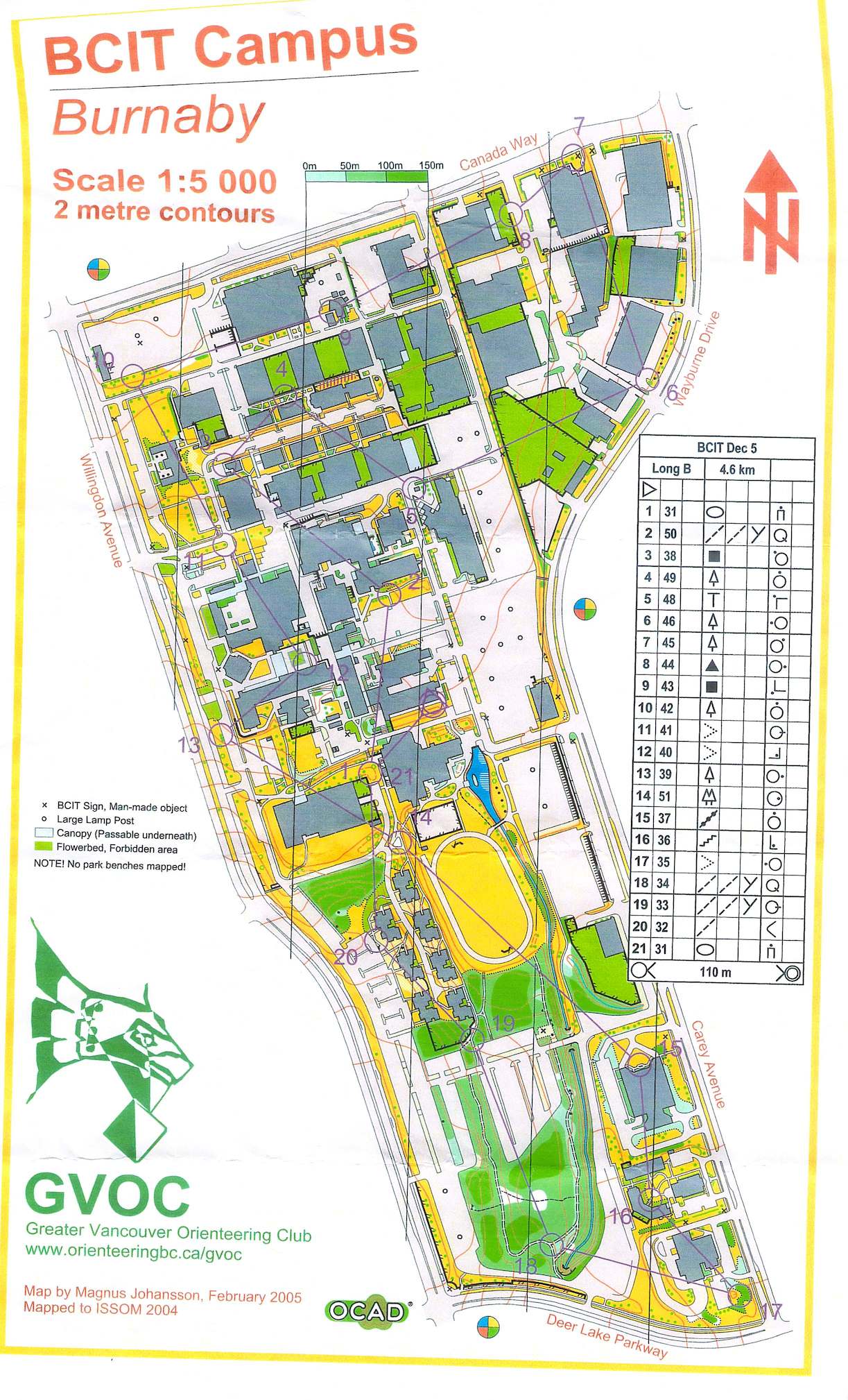 This is a regular point-to-point course with three course lengths. Fun area to run. Meet under the building overhang at the southeast corner of building SE 14 (Library and BCE New Media Centre of Excellance). This is west of Visitor parking lot V3 (pay parking is in effect everywhere at BCIT). Meeting spot is about 80 m north of the Guichon Creek pond.