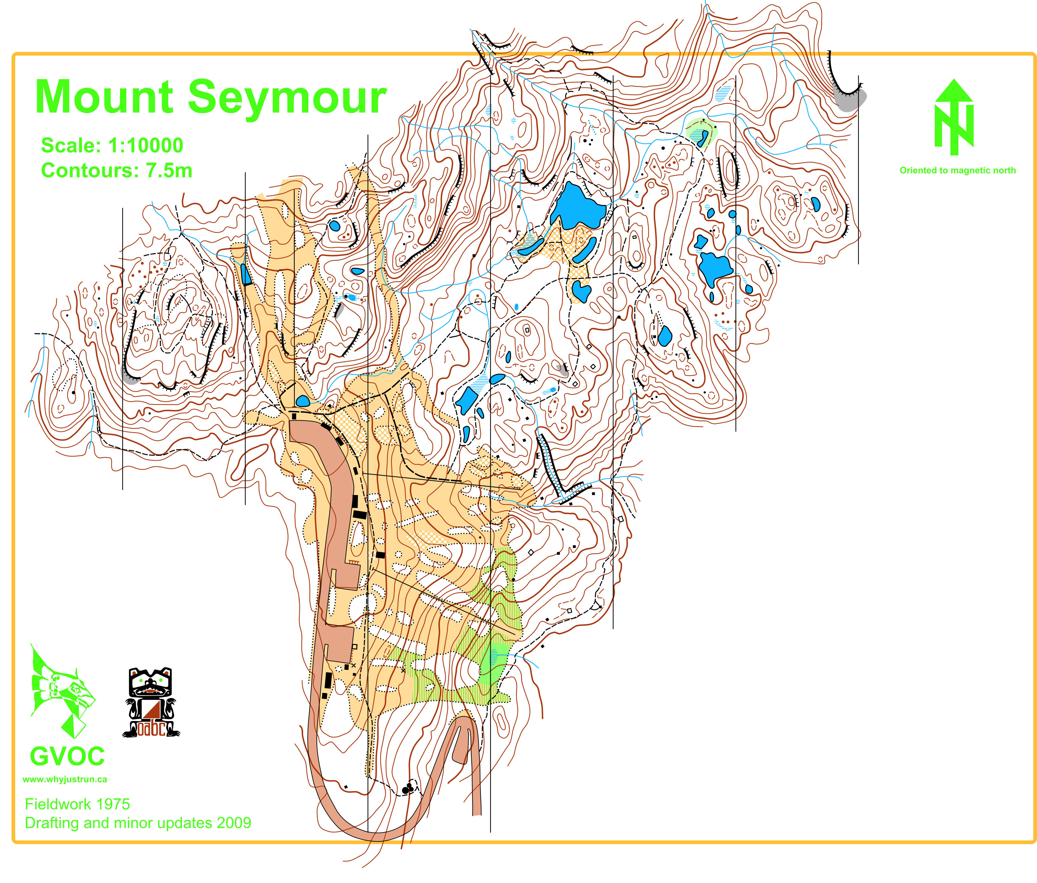 Notes: This map is from 1975, with minor revisions in 2013. The ski runs south of the chalet and north of the car park have changed dramatically. Contours are generally accurate. Some large crags are missing from the map. Water bodies are generally okay. Trails are generally okay, though a few are missing. There are new buildings and chairlifts. The western-most hill does not show large areas of bare rock. Vegetation varies from "actually nice" to "typical north shore".